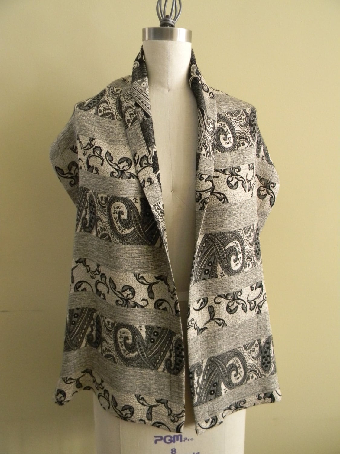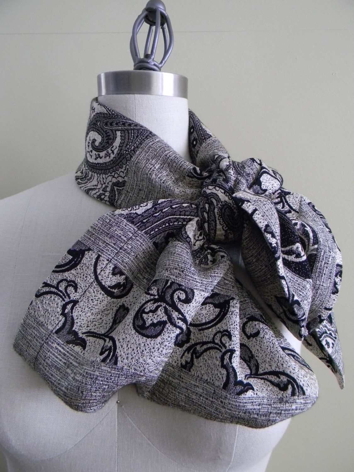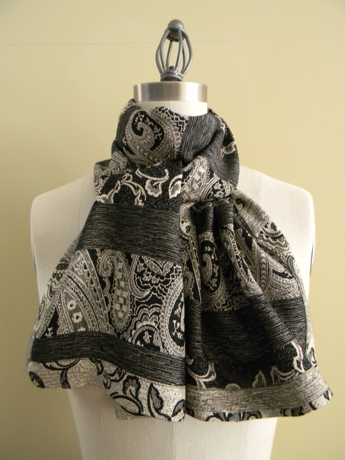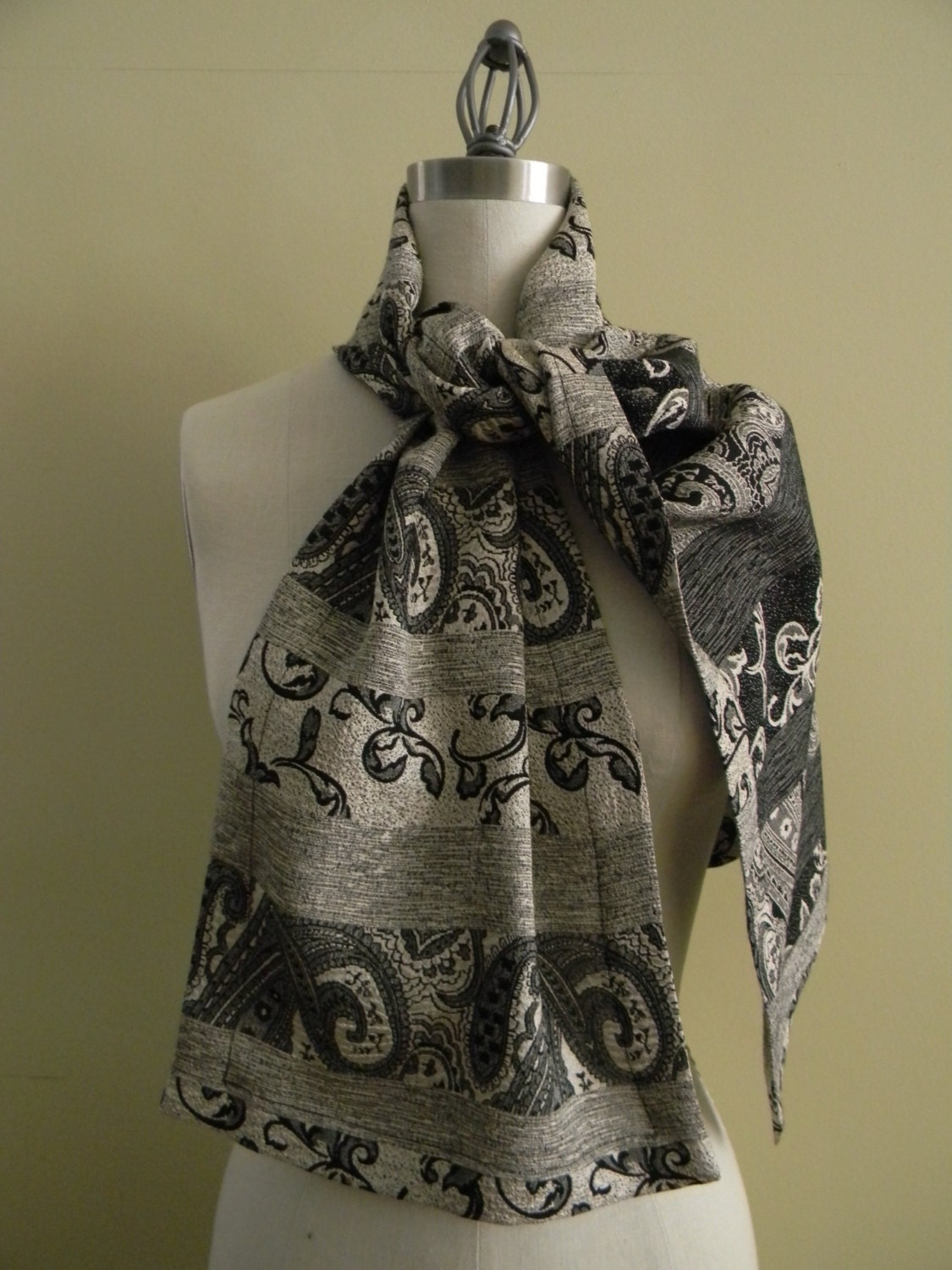 This scarf is made from crepe silk and has a very beautiful paisley pattern imprinted on it, in black, grey and pearl. The materisl has two faces. The scarf is reversible and can be worn as a casual look or can really dress up on outfit.