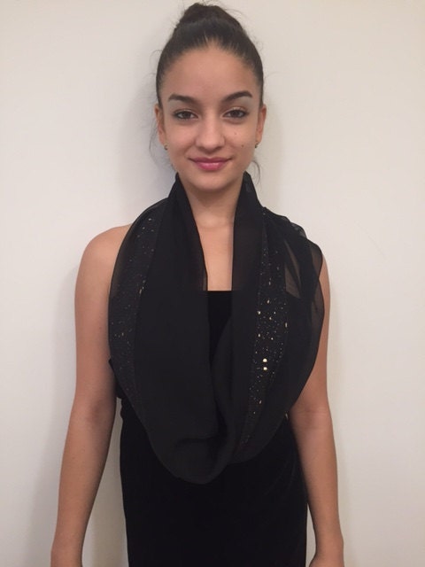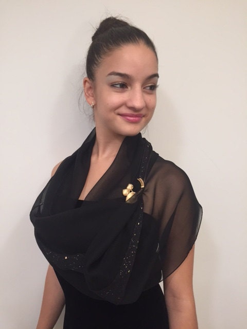 This is a delicate scarf made from light as a feather silk chiffon. An elegant and sophisticate touch gives the scarf the antique gold splash print strip.