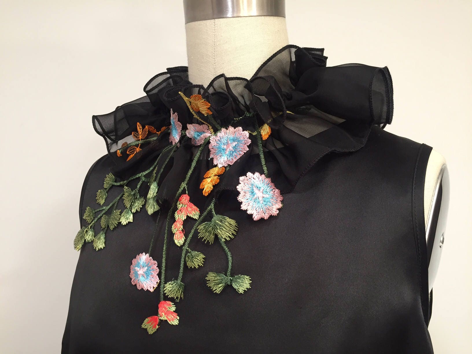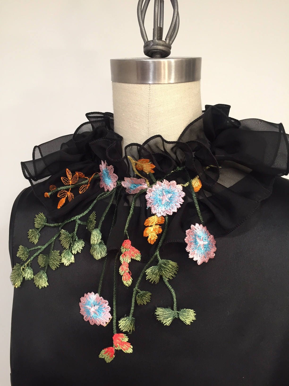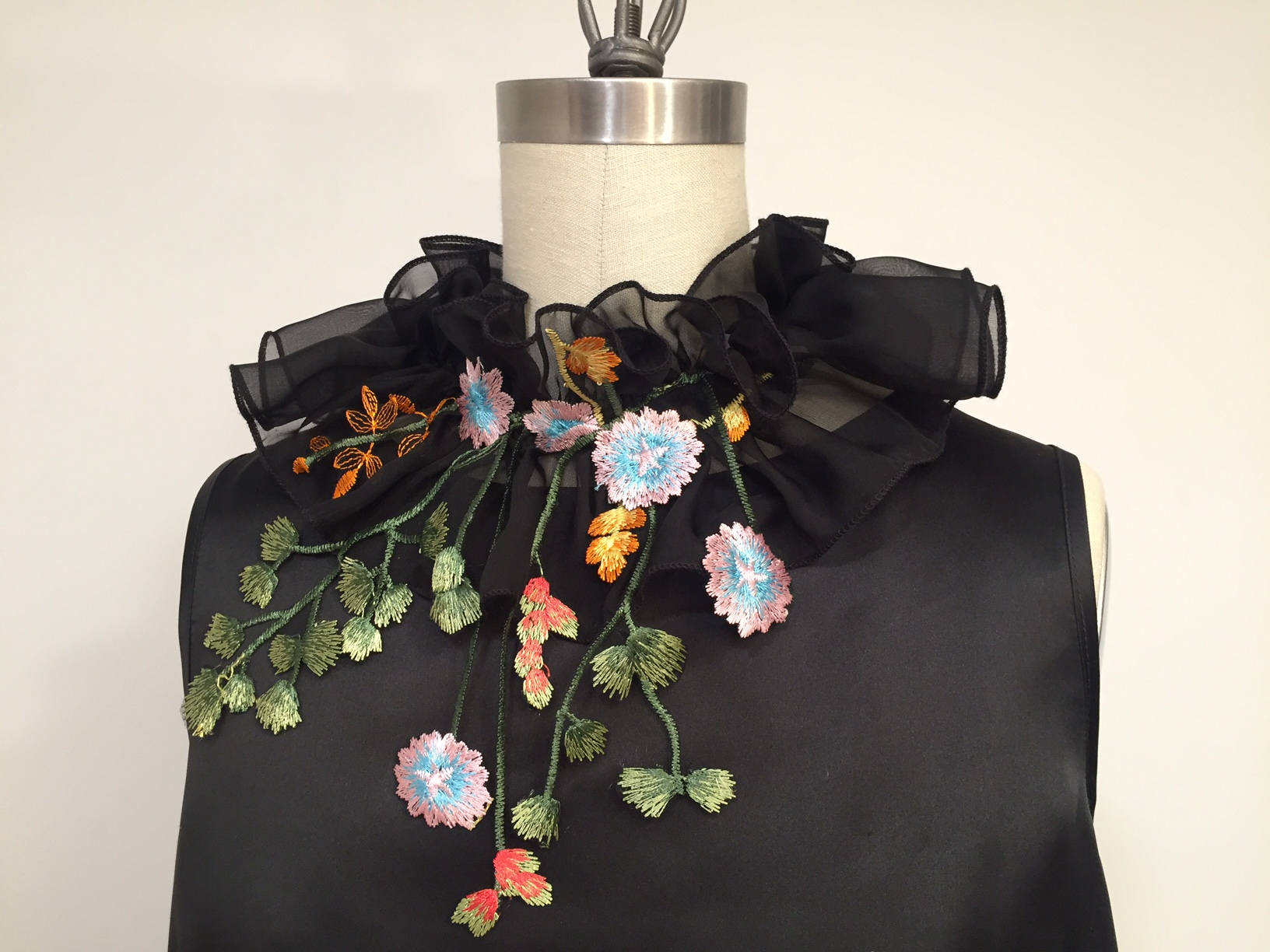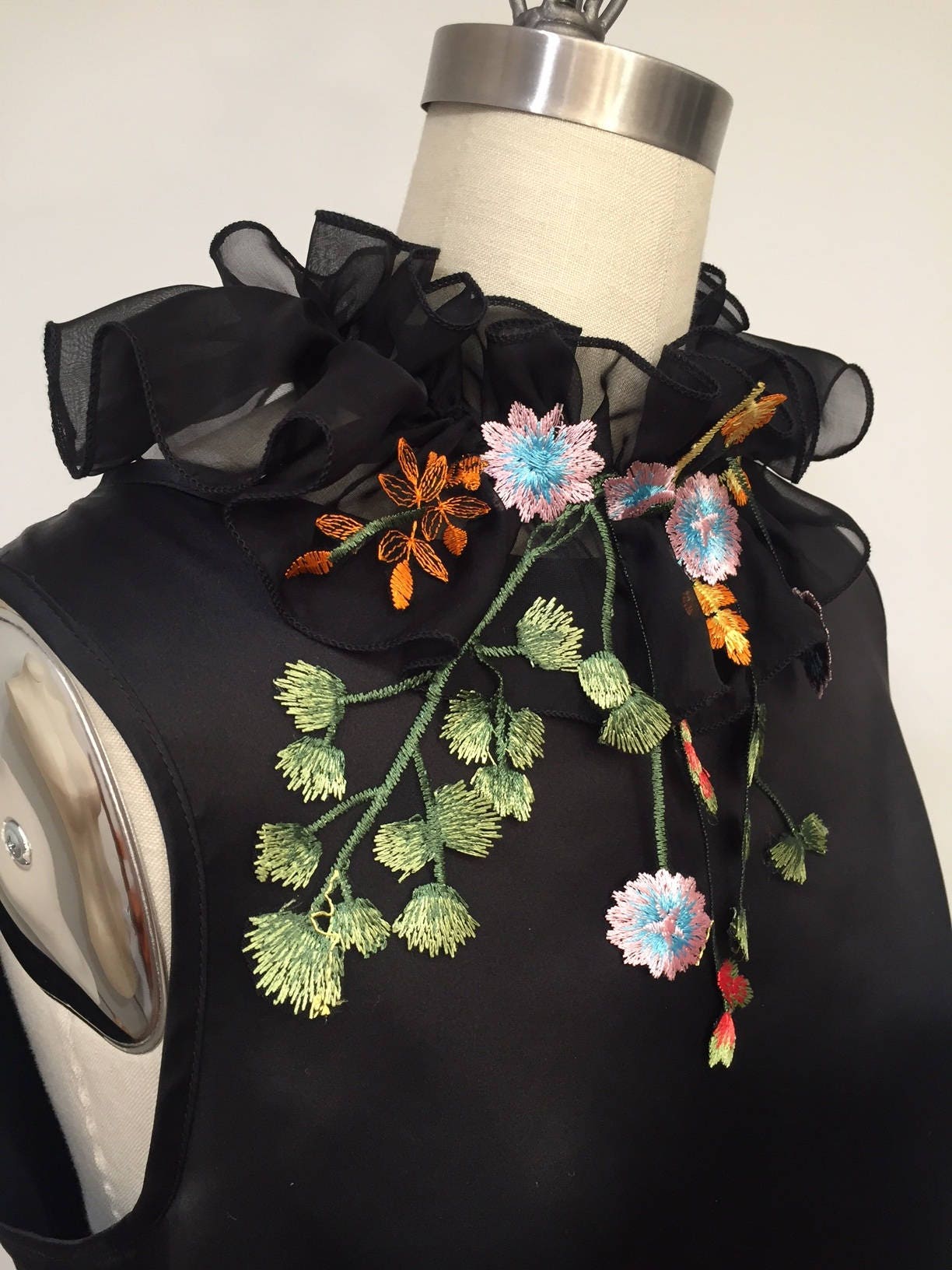 The collar have a black chiffon ruffle highly decorated with a stunning embroidery and finished with a silk charmeuse trim.