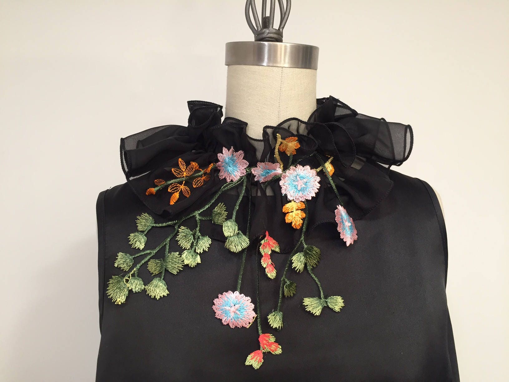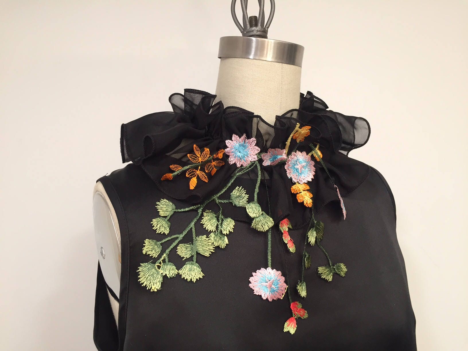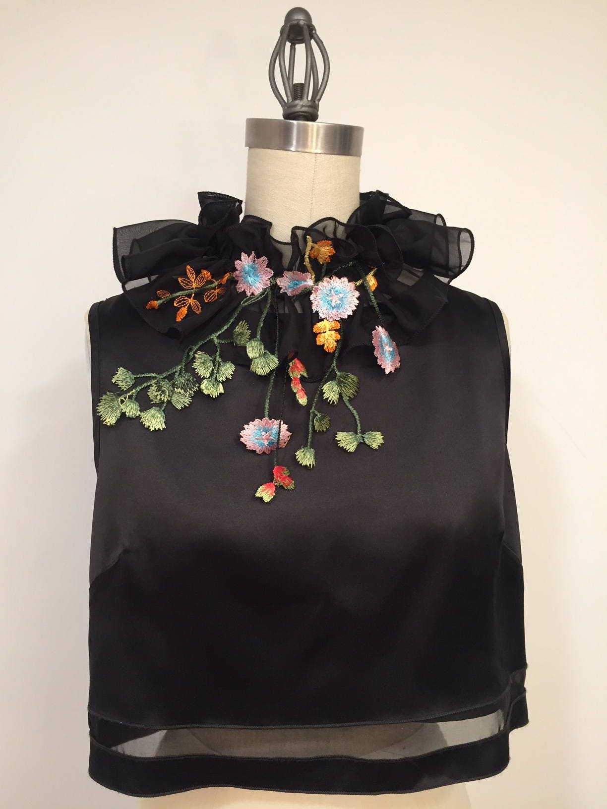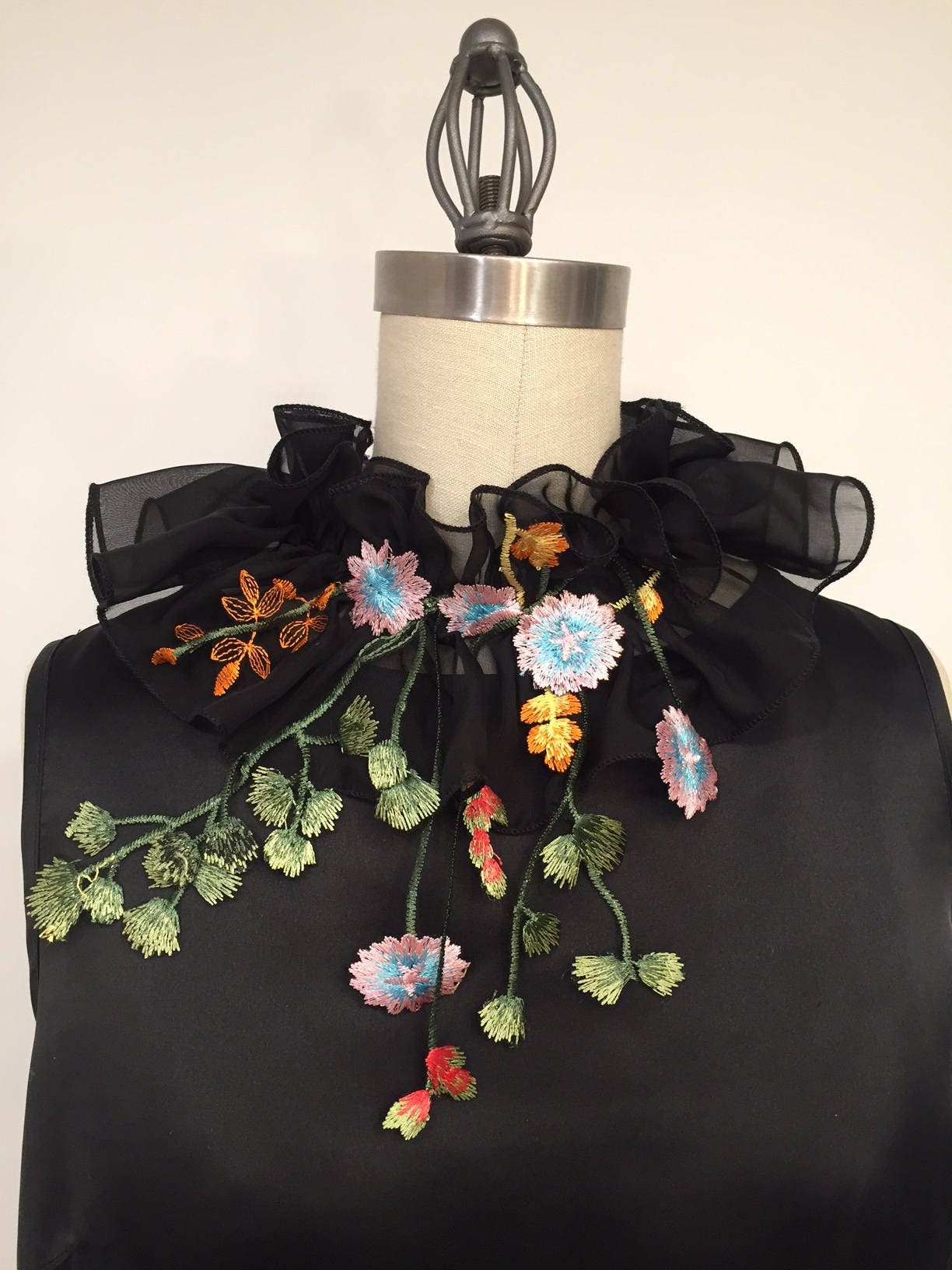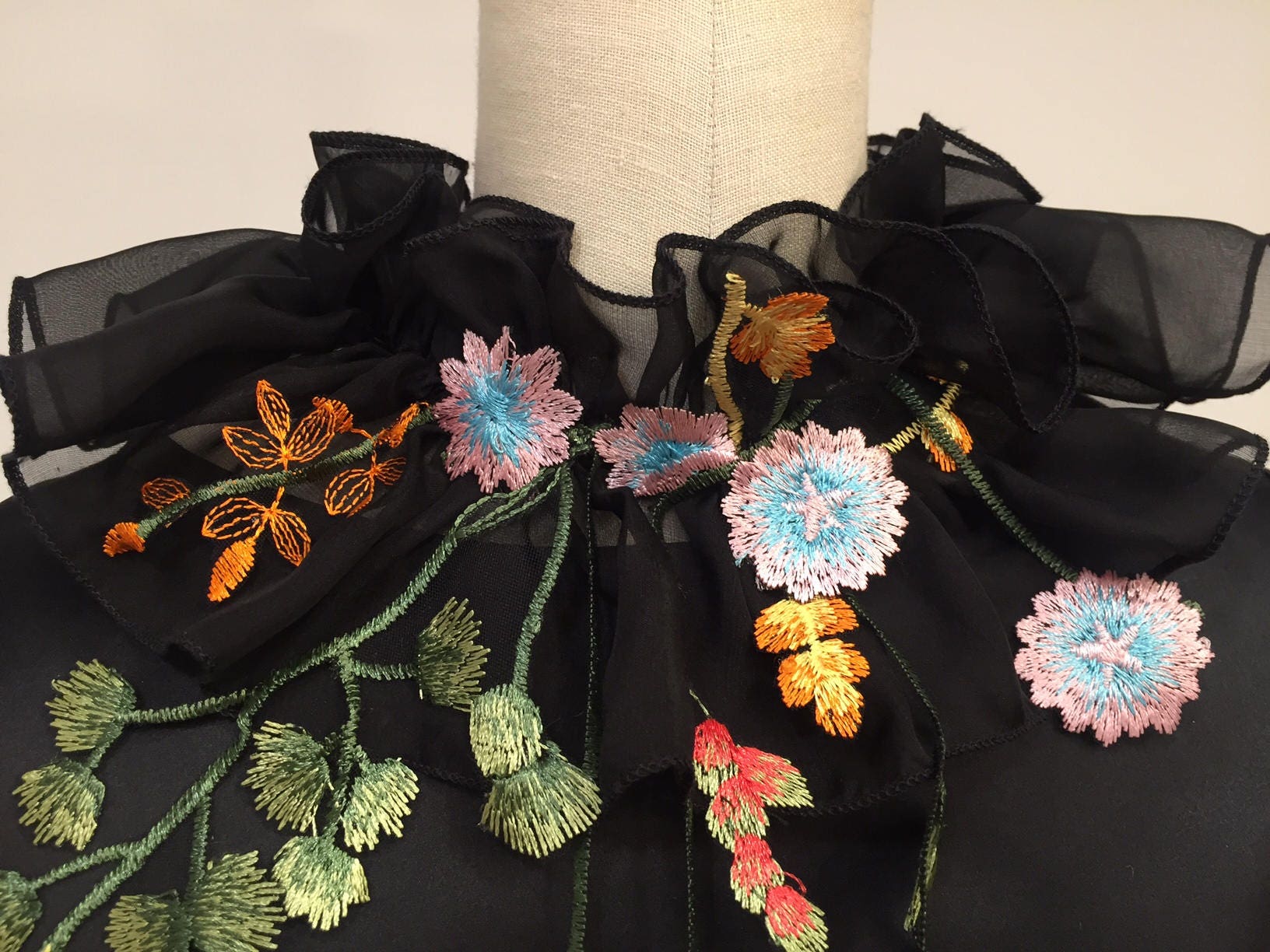 The collar have a black chiffon ruffle highly decorated with a stunning embroidery and finished with a silk charmeuse trim.