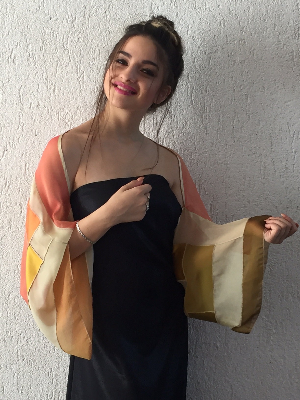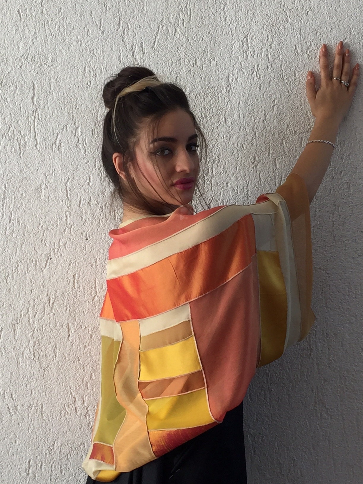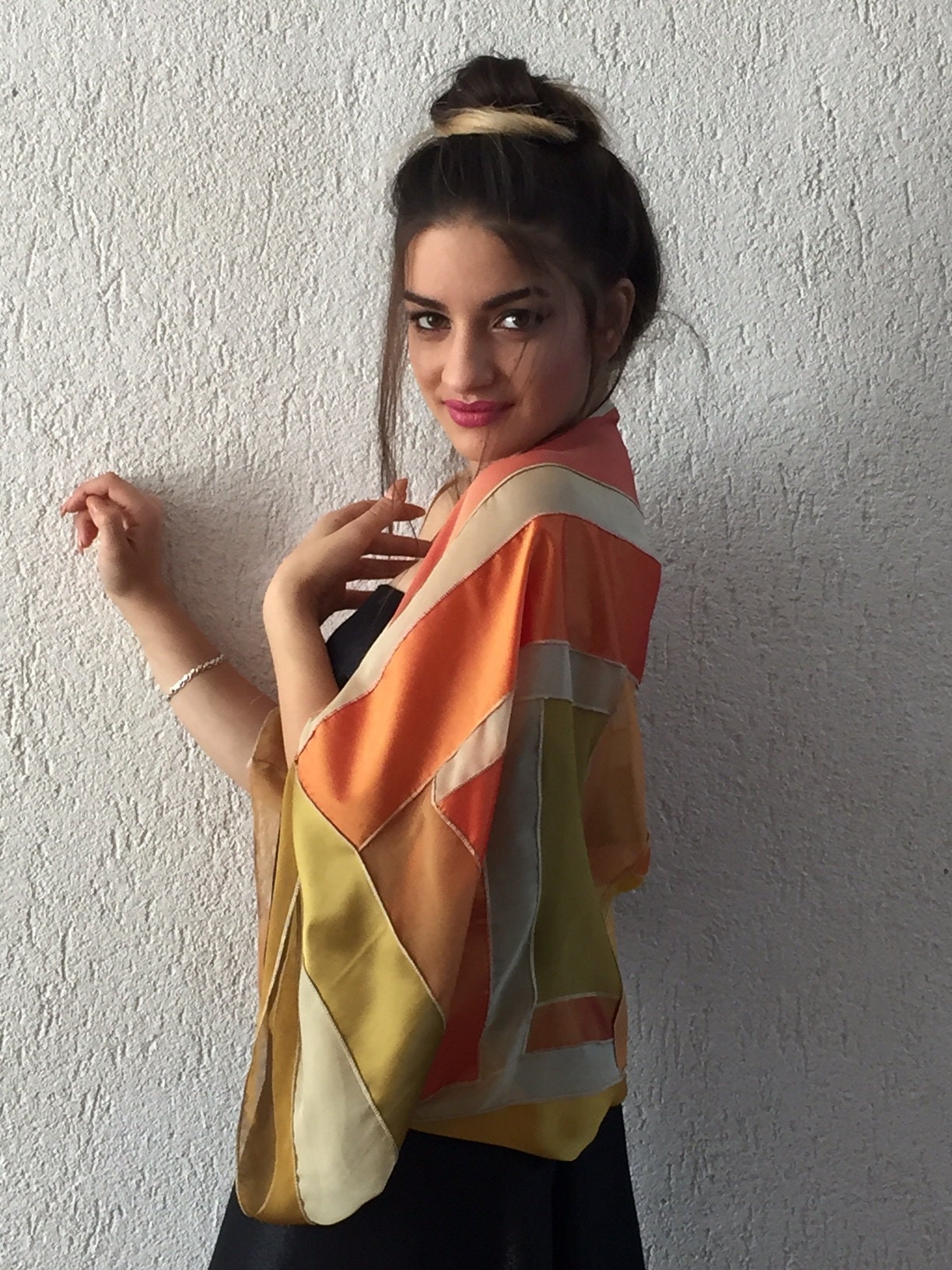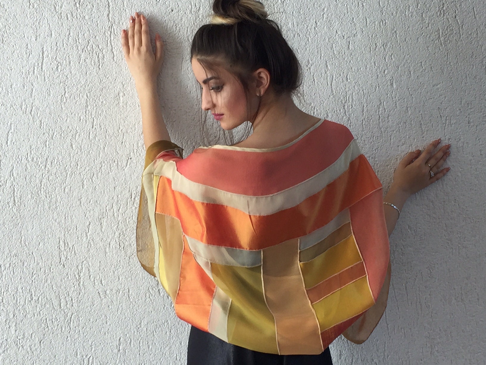 A elegant and luxurious " One of the kind" shrug made out of pieces of different kind of silk: silk chiffon, silk charmeuse, silk dupioni in a beautiful pallet of shades of yellow and orange colors.